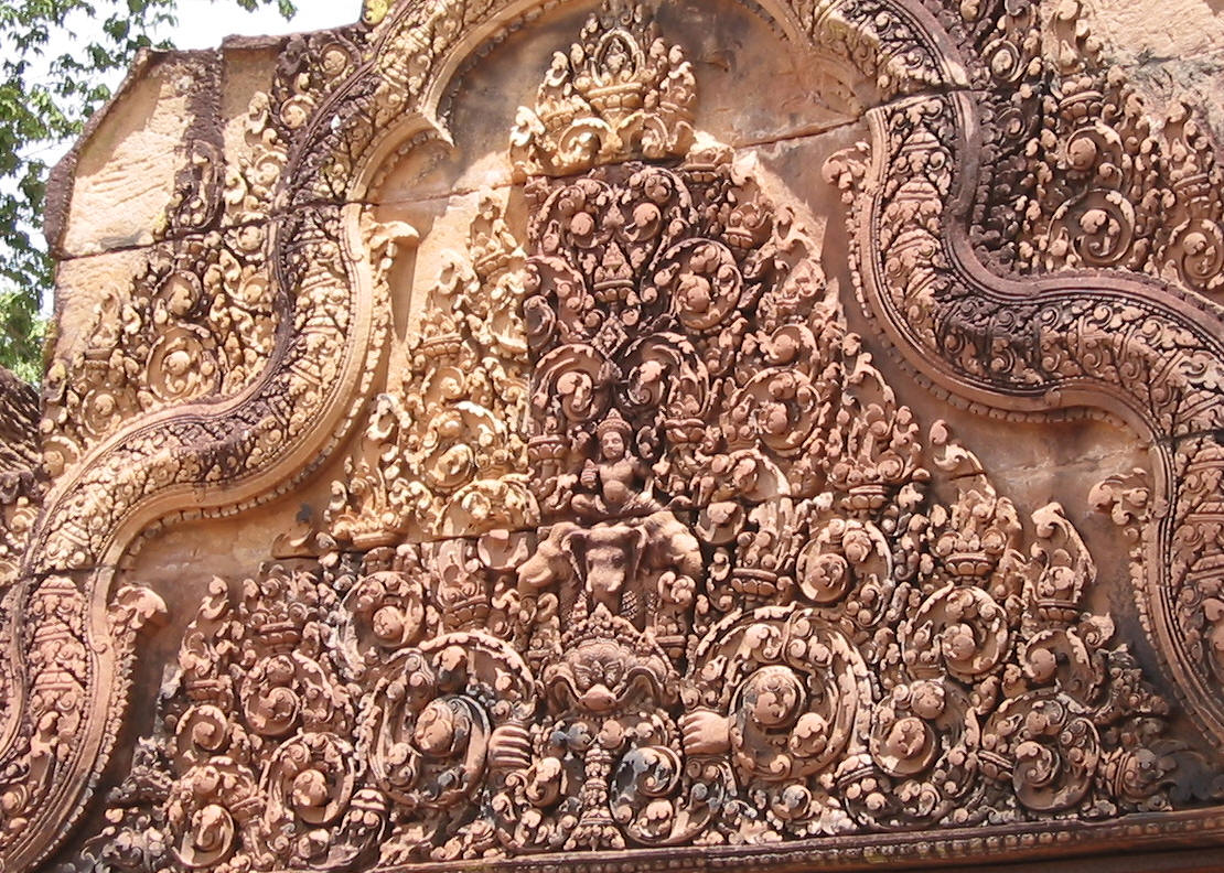 女王宮 (Banteay Srei) ,高棉話即「女人的城堡」之意,『Banteay』在高棉語為「宮殿」、「城堡」之意,『Srei』為「女人」之意,又譯為班黛斯蕾、女皇宮,位於大吳哥東北面21公里,距省會35公里荔枝山(Phnom Dei)旁,是座面向東方有內外三層圍牆的神殿。因所用的紅色石英砂岩質地堅硬不易風化,當年藝術家創作的細緻玲瓏的浮雕仍是保存的鮮明亮麗,是吳哥皇城裡雕刻最精采的建築。女王宮精緻細膩的石雕,巧奪天工的雕功,使得女皇宮獲得「吳哥藝術之珠寶」(Jewel in Angkor Art )的美譽。