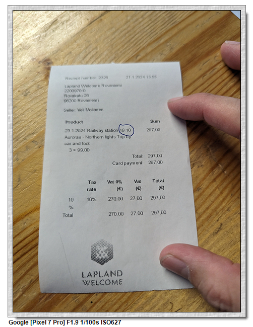 找這家旅行社LAPLAND WELCOME是因為網友有推薦,且好像有中文的店員,可是今天來這只有兩位店員,沒有會說中文的店員。問了一下極光團的時間,原本希望可以明天跑極光團,因為極光預測app顯示明天及後天的KP值比較好, 但店員推薦後天比較有機會看到,他的經驗覺得明天不行,且KP值只能參考。我們猶豫很久,因為後天有參加破冰船的船,怕時間上會來不及。破冰船結束時間大約是16:00,極光團是20:00出發。 店員覺得應該是可以,他認知的破冰船回到羅瓦涅米大約是16:00左右。後來詢問是否有接送,不想再走這麼遠過來,店員回答是可以。就這樣我們預定後天的極光團。