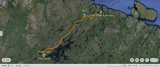 ¤µ¤Ñn±q¥ì¯Ç¨½(Inari)«e©¹§Æº¸§J¤º´µ(Kirkenes)¡A¥Ñ©ó¬O¸ó°ê¹Ò¡A©Ò¥H§ÚÌ¿ï¾Ü¥]¨®¡A¶O¥Î382 £á¡A¤]¬Oºô¤Í±ÀÂ˪º(¦³´£¨Ñºô§})¡C