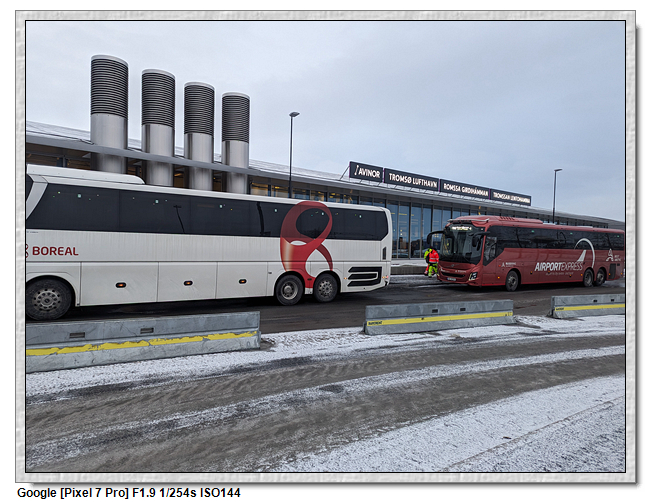 從特羅姆瑟(Tromsø)機場到市中心的公共交通有兩種選擇,一種是直接在機場前門搭乘的機場巴士,可在機場内的機場巴士售票機購買車票,但是票價較昂貴。另一種是穿越機場停車場到達市區的24、40、42號公車站牌的公車,可在機場的便利商店或車上購票。