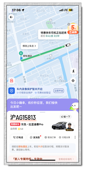 原本以為滴滴打車來的有可能會是台計程車,結果來了私家車(大陸用語叫網約車),跟用UBER一樣,會預算車資,但不會先扣款(UBER會先扣款),等到達目的後才扣款,有時會有優惠券便宜了一些,有時又會貴了一些錢。 但每次跟預估的金額對不上。
