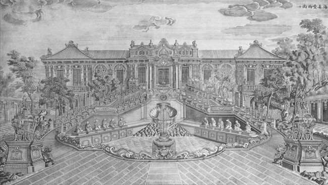 海晏堂由正樓和後工字蓄水樓“錫海”組成,是最大的一處歐式園林景觀。海晏堂正樓朝西,上下各十一間,樓門左右有疊落式噴水槽,階下為一大型噴水池,池左右呈“八”字形排列着我國十二生肖人身獸頭銅像(圓明園獸首銅像)。每晝夜十二個時辰,由十二生肖依次輪流噴水,正午時,十二銅像口中同時噴射泉水,這些銅像是西方人設計,在中國製造的,融東西方文化於一身俗稱“水力鐘”。