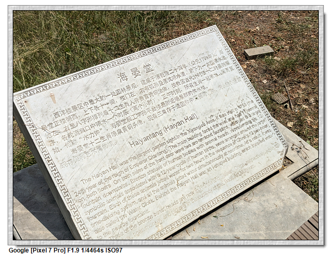 海晏堂遺址,三合土高台前有一個3塊巨石刻做的蚌殼,這個大蚌殼就像一朵碩大無比的蓮花,這便是當年“海晏堂”的西門。這座洋樓一反中國皇家建築的傳統,坐東朝西,因此西門即為正門。