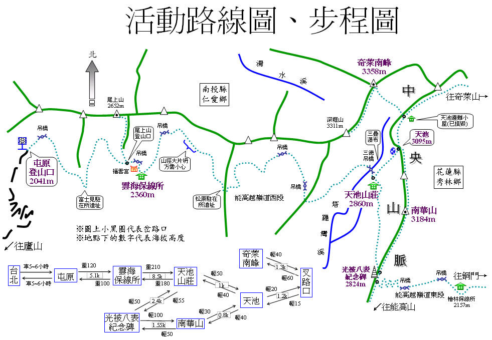 08:00屯原登山口出發----09:45到雲海保線所﹙休15分﹚-----14:00天池山莊﹙休30分﹚16:30界碑﹙光被八表﹚---------17:30天池山莊