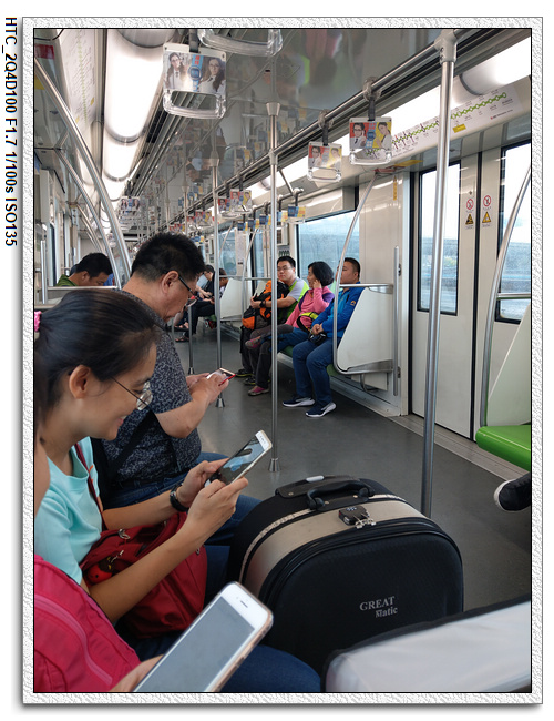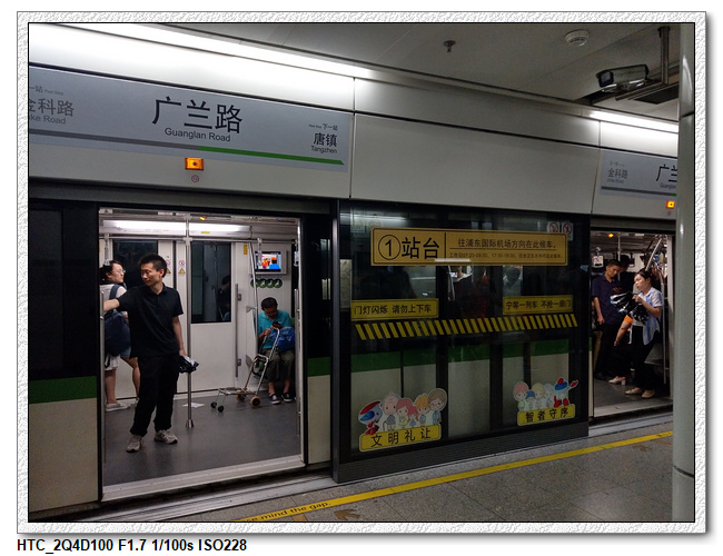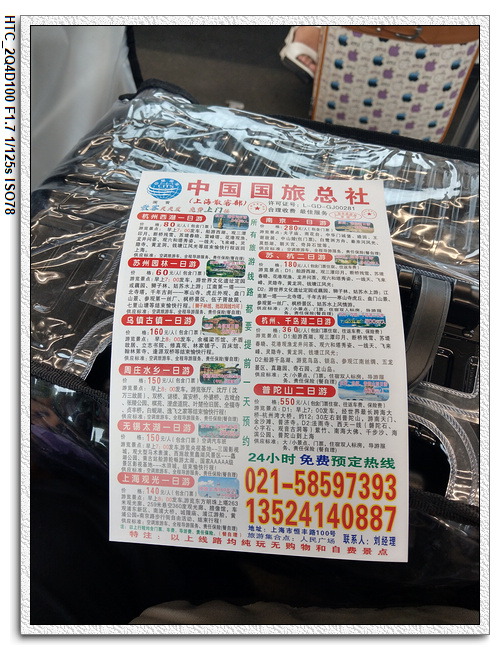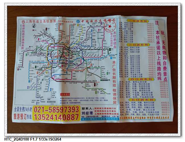 從浦東國際機場到廣蘭路的路上,有人在車廂裡發傳單,不拿還不行,硬是放在你旁邊,整個傻眼。拿起傳單看了一下,正面是一日旅遊的文宣,背面則有上海地鐵的路線圖,看來這傳單對我們很有幫助,後來的幾天都是靠這張傳單研究路線。