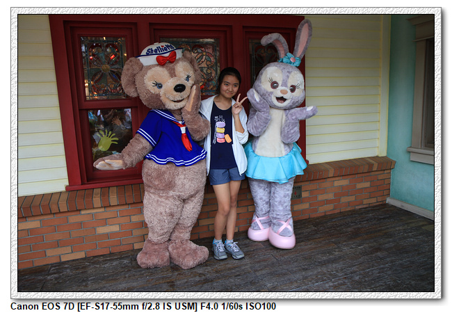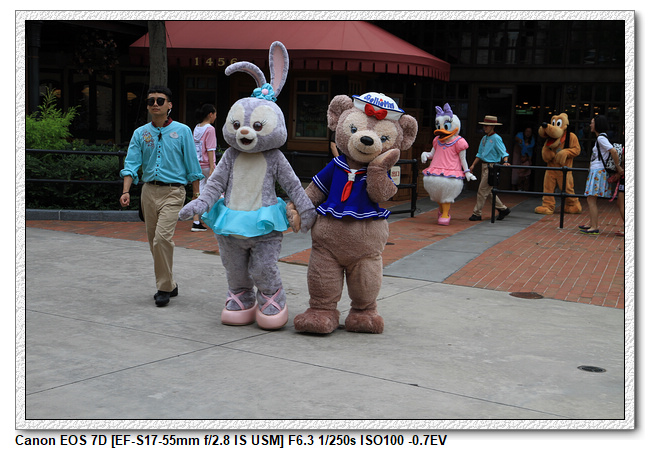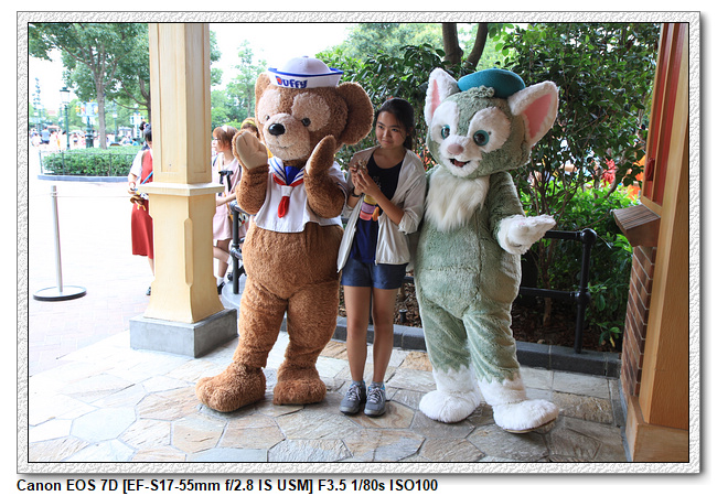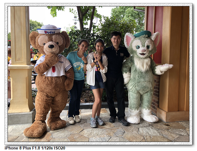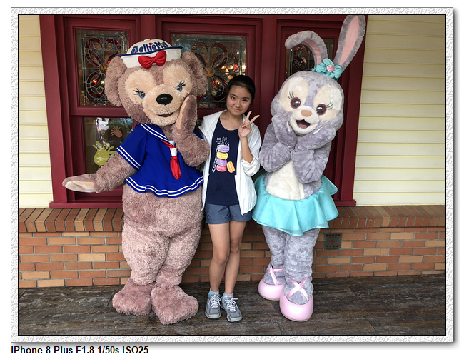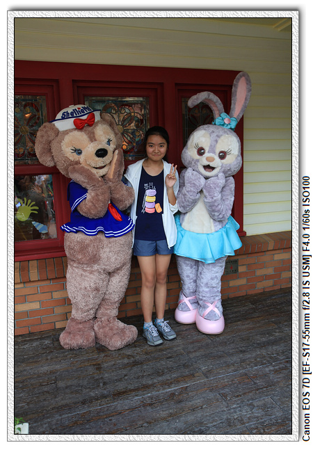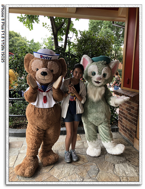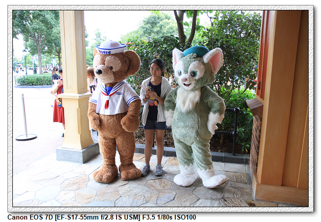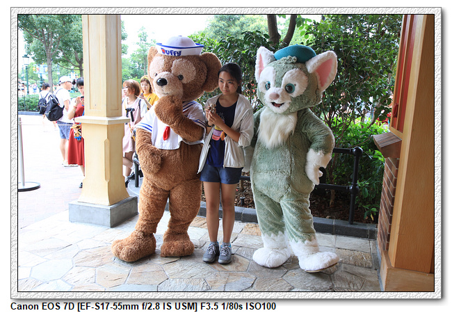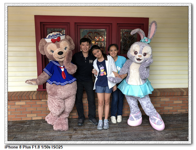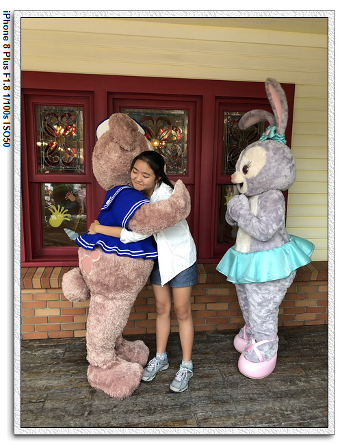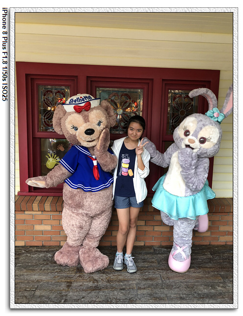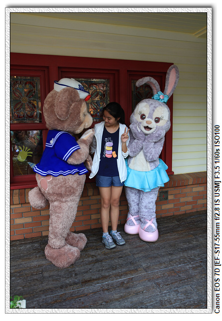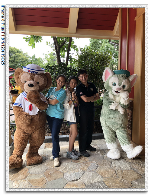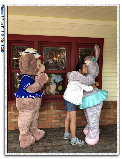 不過,就在尋找老車站商店的途中,意外遇到雪莉玫&星黛露出巡,我們就一路跟隨他們,來到拍照地點等待。滿幸運的,還算是排的前面,在我們前面只有三對6位,感覺應該很快就輪到。但是,事情不是我們這些非專業達粉想的這麼簡單,前面有對專業粉絲,除了擺大量各式動作之外(好吧,難免的行為,畢竟也不是常來這拍照),竟然拿出簽名簿(忘了拍照,真可惜),沒想到雪莉玫&星黛露也很自然地就簽了,實在很好奇穿著一身 布偶裝,是要怎麼簽名(聽說還簽得很漂亮,還會畫愛心,有練過的)。