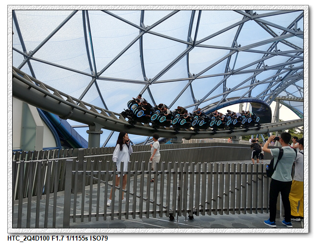 創極速光輪,一開始小雨還很害怕不敢玩(還不小心排在第一台車),結果一趟下來之後,小羽竟然喜歡上這個設施,後來晚上結束前又玩了一次。之後在老車站商店排隊等達菲+傑拉多尼拍照時,跟前方一位當地媽媽聊天(據說他們已經來迪士尼大約20多次了,是買季票),光輪已經有降速過,目前大約是80公里的速度,剛開幕時是120公里,很多人結束後都被送到旁邊的醫護室。