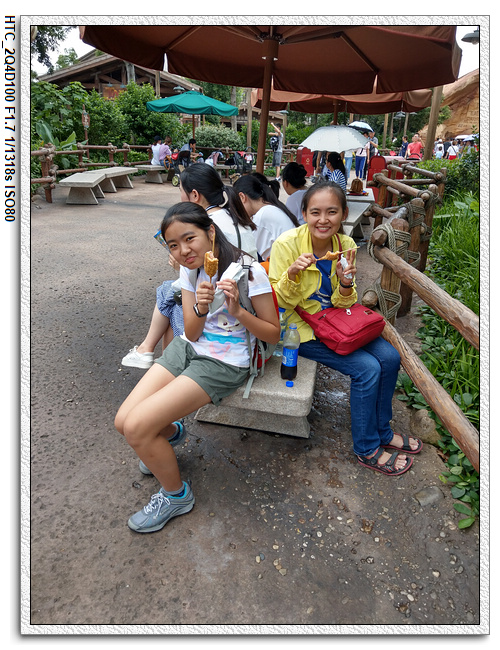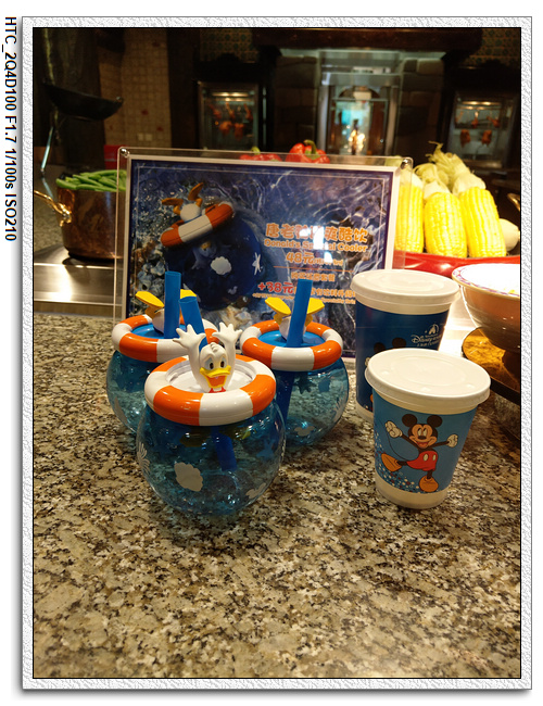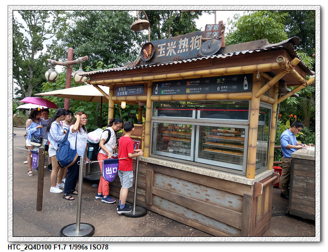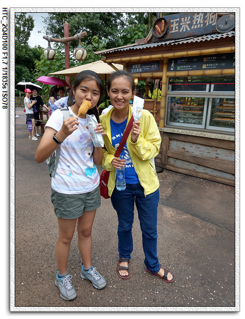 今天上午光是排隊一個長長的飛越地平線,就已將花了一個上午。結束時都已經是11點了。雖然上海最近很常下雨,但今天上午異常悶熱,不過還好這個設施排隊是在室內,又有空調,不過排了兩小時,有是會消耗體力的。沒吃太多的早餐,11點也差不多肚子餓了,就在出口處買了玉米熱狗+可樂,雖然不是這裡的特產,但還滿好吃的。一開始以為是熱狗裡有包玉米粒,其實是熱狗裹玉米粉。