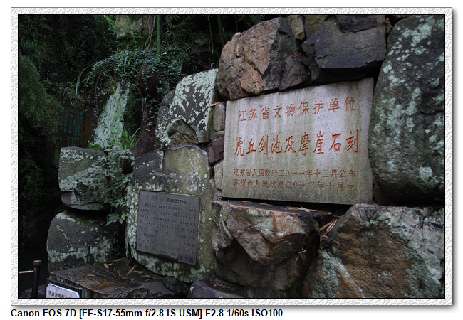 虎丘風景區內的「虎丘劍池」位於千人石北方的石壁上,雕鑄出自唐書法家顏真卿的之首的四個大字,也有傳說現在虎丘二字已顏真卿真跡,為後人所補刻的,因此有句俗話說「真劍池、假虎丘」。