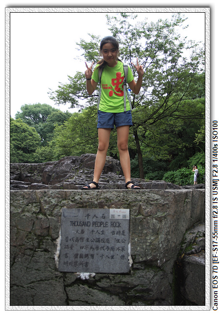 千人石位於虎丘主景區,旁邊便是劍池。石體巨大,呈紅色,可坐千人。關於此石有兩種傳說。其一為吳王闔閭死後,夫差將造闔閭墓的工匠千人戮殺於此,鮮血染紅石頭。另一種說法為梁代高僧生公曾經在這裡講法,眾人來聽,因而得名。
