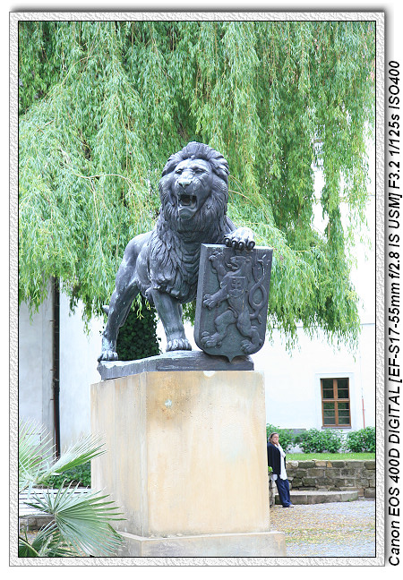 庭院中有隻獅子的雕像,獅子是代表波西米亞民族。而獅子腳上的小盾牌則是小國徽
