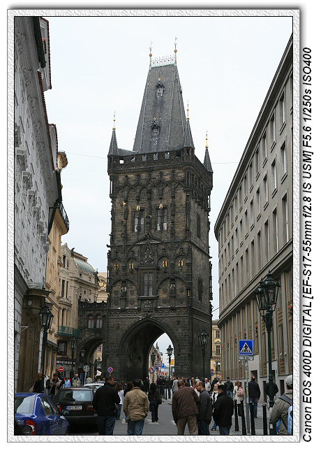火藥塔是11世紀興建舊城時所建的13座城門之一,當時從銀礦產地運來的貴重銀器與錢幣就是從這個城門進入布拉格。另外,國王的加冕典禮遊行,也會從火藥塔經過。火藥塔參照舊城橋塔搭建成哥德式建築,與典型軍事防禦型城門不同,以豐富的雕飾取勝。到了17世紀,成為存放軍火的地方因而得火藥塔之名。