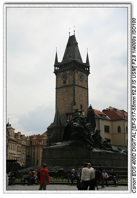 胡斯雕像,紀念15世紀宗教改革家胡斯(Jana Husa)對抗墮落羅馬教廷的英勇精神。胡斯出生於波西米亞貧窮農家,憑著豐富的學養與過人的口才擔任卡列爾大學教務總長一職,虔信基督教的胡斯因不滿天主教權勢者的貪污奢華,舉辦多場演講,招攬了許多信奉者,後來的人稱他們為胡斯派。