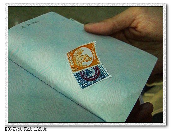 入境時,埃及導遊助手-阿布,用"口水"黏在護照上的「郵票」(應該是簽證之類的東西)。阿布長的很像李察吉爾喔!(只有背影~)