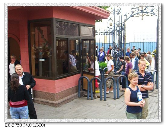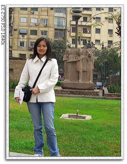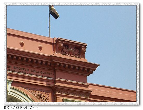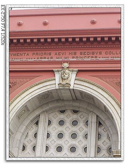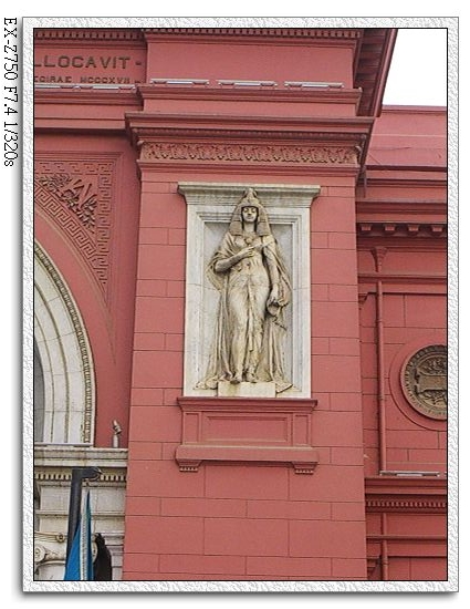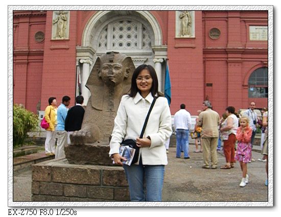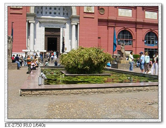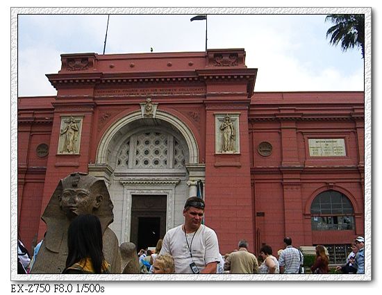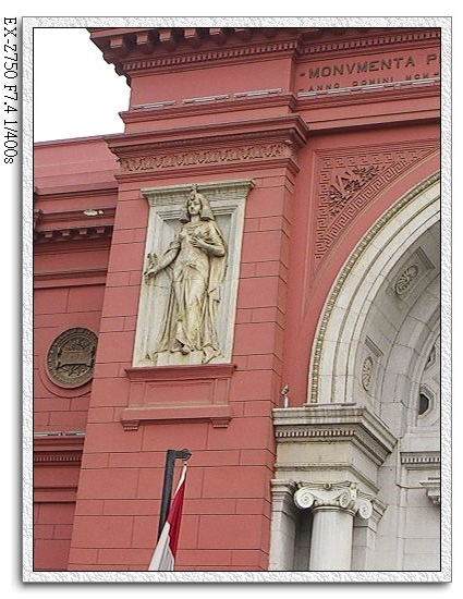 到達「開羅博物館」,入眼是一紅色建築物,進入前每個人皆須經過X光安檢,才能進入博物館前廣場。之後所有的景點皆有X光安檢,包含一般飯店也有裝設X光機。(沒辦法,觀光目前是埃及的生命。自從上次"喋血事件"之後,埃及政府就很緊張了,江浩說,那時他有2年沒工作~)