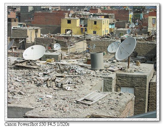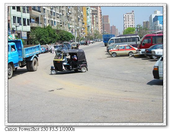 在開羅,幾乎家家戶戶都裝小耳朵,據說這樣比較省錢且可看的節目比較多。房子外觀好像剛剛完工一樣,好像工地。開羅也是全世界幾個嚴重塞車的城市之一,車流量不比台北差。有趣的是,開羅沒有紅綠燈,在路口時完全是看個人,就連路人也是隨意想過馬路就過,可是發生車禍次數相當少。另提,埃及汽油一公升,1埃磅。
