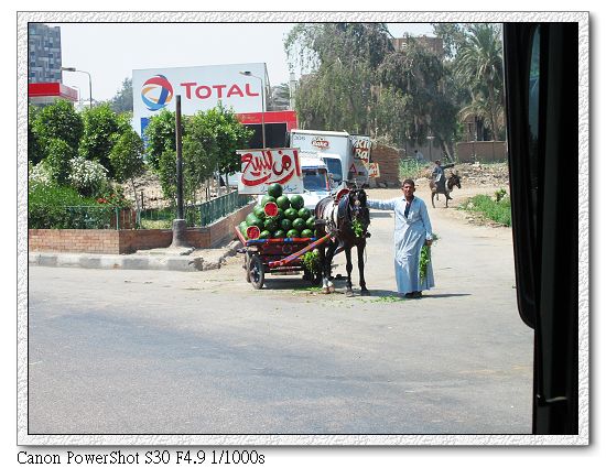 開羅偶爾可見拉馬車的小販,不過這在大城市市禁止的,原因我忘了。不過在鄉村時常可見。(這小子偷賣,不過西瓜看起來好好吃喔~)