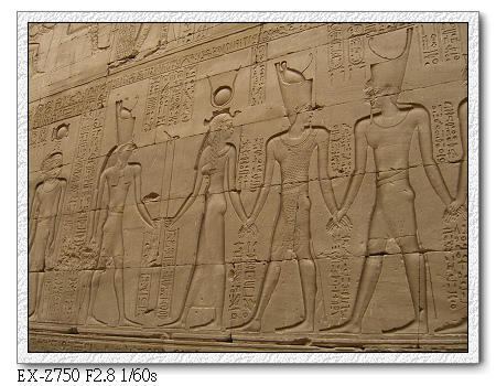 荷魯斯神殿有個特色,壁畫左右對襯,只有一個區別,兩邊國王戴不同皇冠(左:下埃及、右:上埃及)。