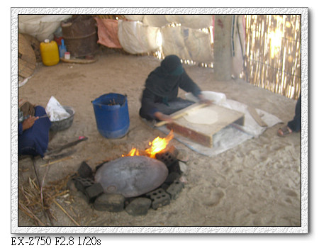 貝都因人的燒餅(照片中是那位小女孩的媽媽),先把麵糰(應該是麵糰吧~)壓扁。