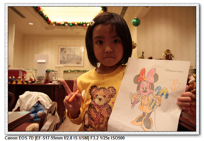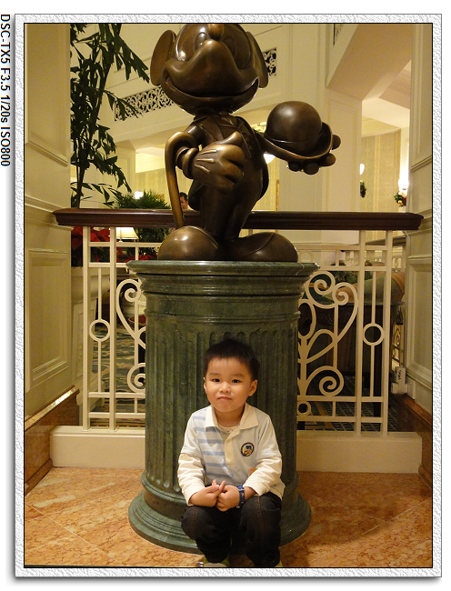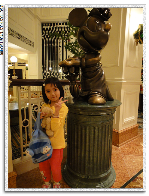 一進酒店,當爸爸的當然要盡責去check in。這間酒店有名的不是房間,也不是餐點很好吃,而是它的餐廳會有迪士尼人物跑來跑去。因為事先餐廳訂位有優惠,所以之前在台灣時就已經打電話訂位了。所以check in時同時確認晚餐以及隔天早餐的訂位,並把該付的帳先付清。