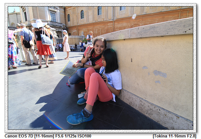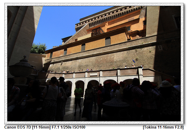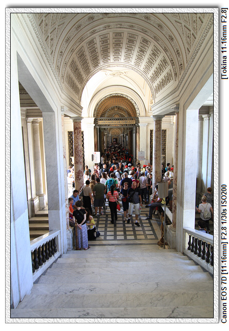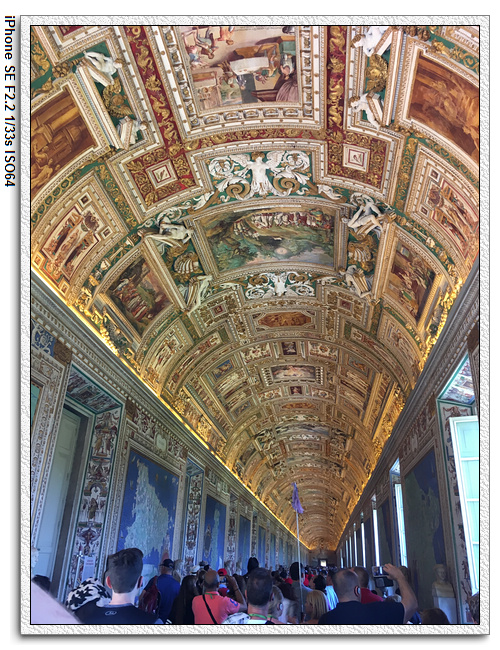 西斯汀禮拜堂 Cappella Sistina (唯一博物館不允許拍照的地方),西斯汀禮拜堂建於1445年由當時教宗西斯都四世(Sixtus IV)發起興建,並以他名字命名,為羅馬教皇私用經堂,以及紅衣主教團舉行教宗選舉的地方。這禮拜堂欣賞重點在於高28.8公尺的天花板由米開朗基羅在1508~1512年期間第一次當畫家所繪製的作品 ─ 《創世紀》的九個故事,據說米開朗基羅座畫這四年都沒有脫過他的靴子,使得四年後要脫靴子時皮已經黏著肉了。另外,在畫《創世紀》時除了教宗外,不准別人看,但教宗實在是很想知道他的進度,後來直到教宗下令把他的作畫鷹架拆了,才讓教宗和準備要畫署名室的拉斐爾見識到米開朗基羅在畫作上的那種肌肉線條分明及人物的神韻,使得拉斐爾在畫《雅典學院》時也調整自己的畫風,並將米開朗基羅畫進去,也就是唯一穿靴子的男人。從這些小故事就可見得米開朗基羅是個很執著的人。