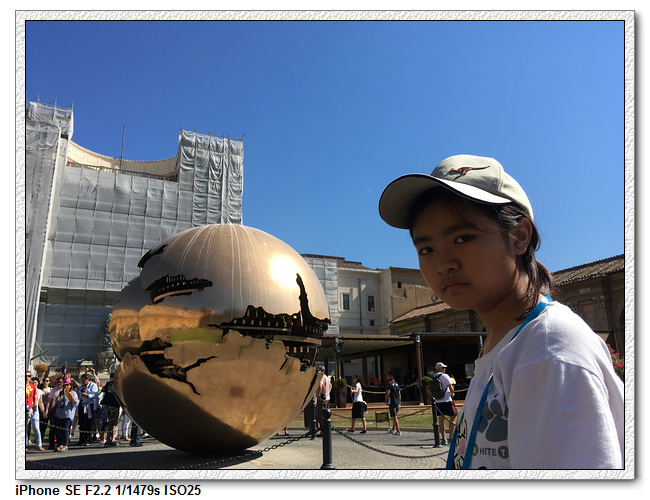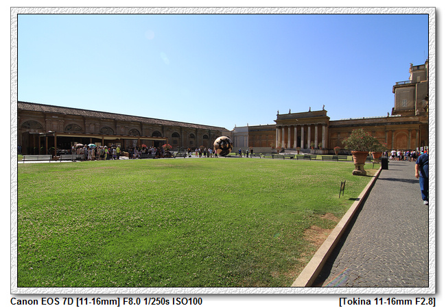 一開始先進入庭院中央,最明顯的是一個巨大的金色球體的雕塑,名為《球中球》,這顆金球是由義大利當代藝術家 Arnaldo Pomodoro 在 1990 年所創作。四周則放置一些待修復的古蹟。這個《球中球》大球裡的確還包藏著小球。據說小球代表地球,大球意喻基督,意味著地球在基督的庇護裡。