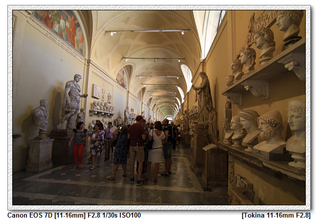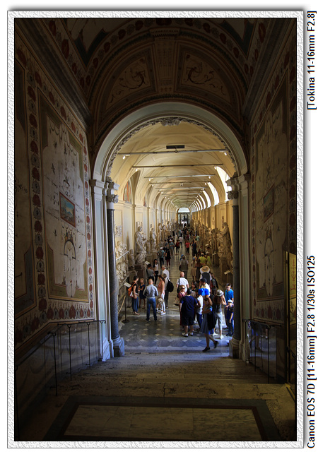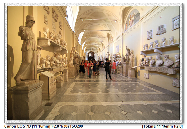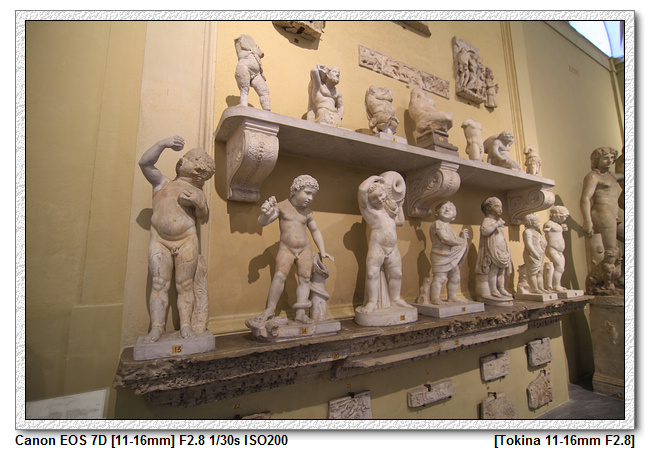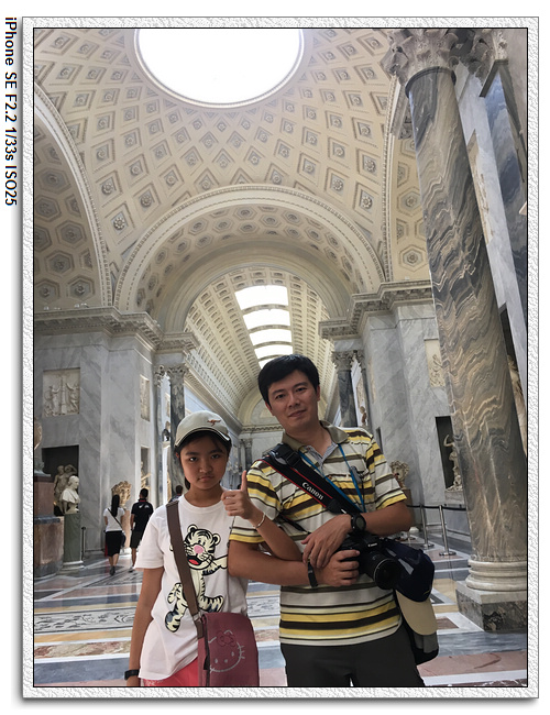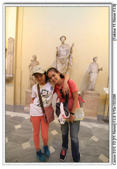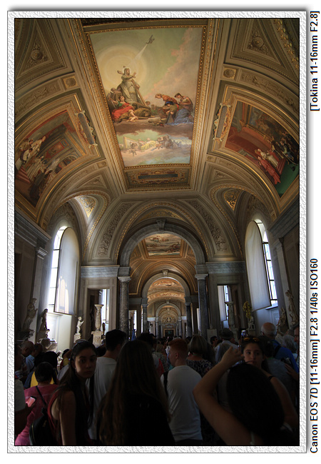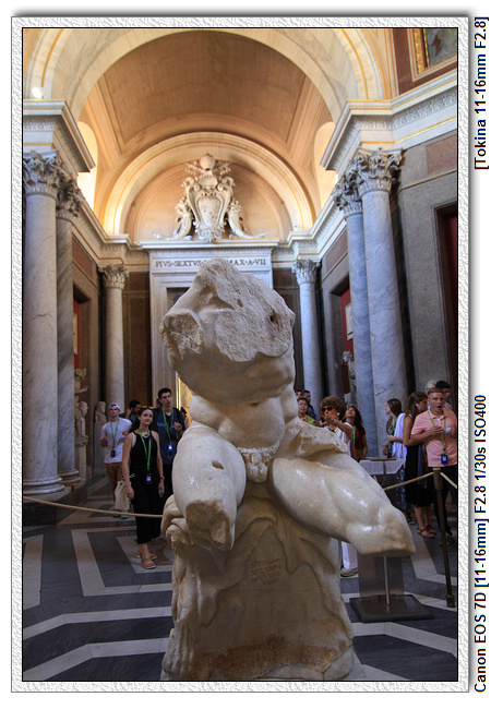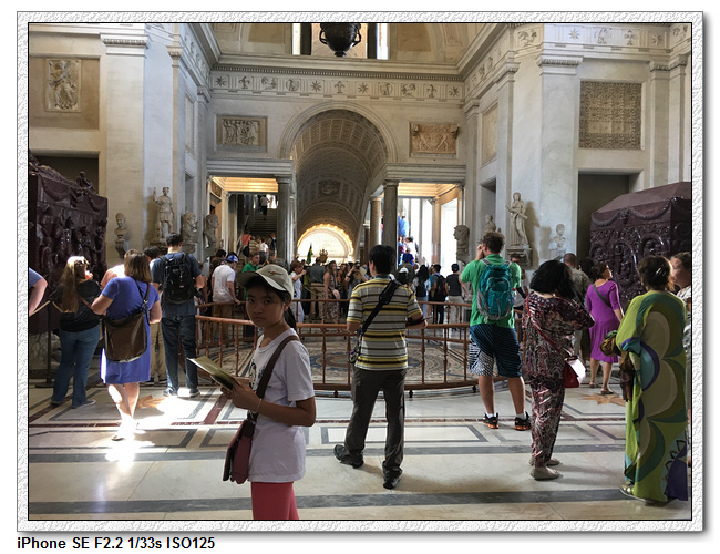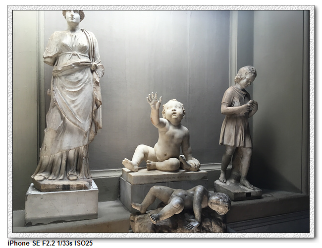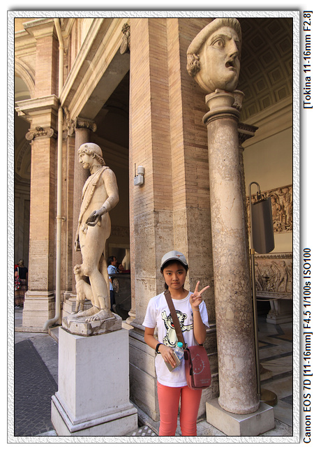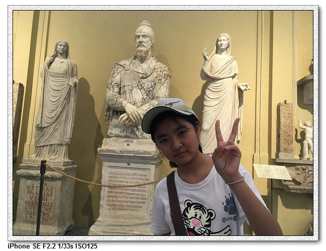 離開松果中庭之後,進入基拉蒙提博物館(Museo Chiaramonti),這裡陳列許多羅馬神祇 、羅馬帝國歷任皇帝等雕刻作品。第一次這麼近距離的看羅馬雕像,真的刻得微妙微翹,雕像身上的衣服皺摺好像是真的衣服一樣,衣服貼在身上的曲線也表現得很真實。有趣的是,很多男性雕像的生殖器,被後人蓋上葉子,顯得很不協調。據說是在1857年,教宗庇護四世覺得男性器官會激起淫慾,所以他拿著榔頭和鑿子,把幾百尊雕像都去勢了,後人替這些被去勢的雕像加上無花果葉遮掩。