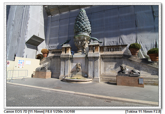 神廟。在中世紀移動到老聖伯多祿大殿的庭院,然後在1608年移動到現在的位置。噴泉兩側的青銅孔雀是皇帝哈德良陵墓(現在的聖天使城堡)裝飾的複製品,原來的孔雀就收藏在博物館內
