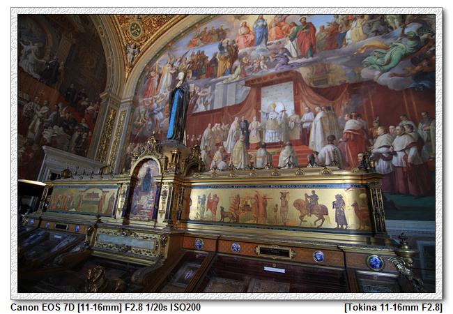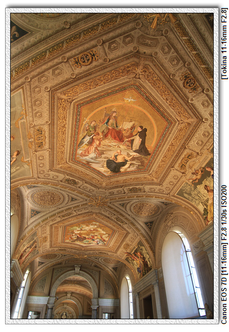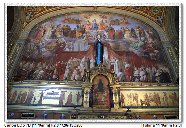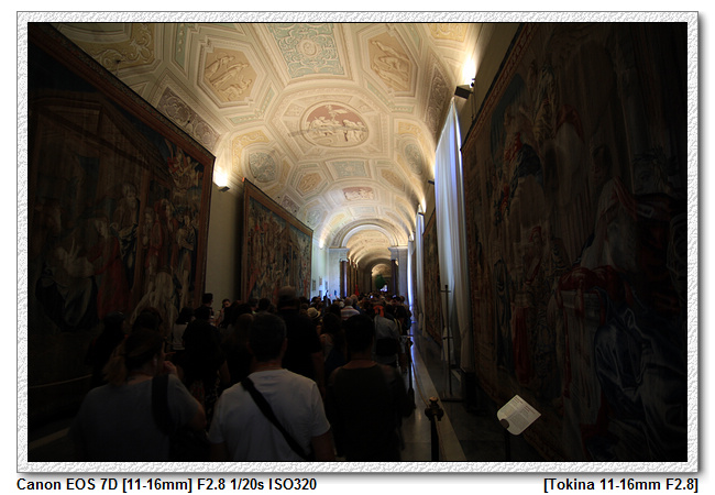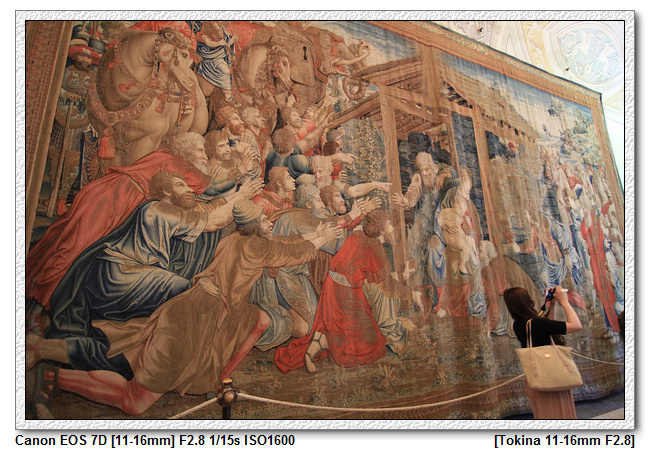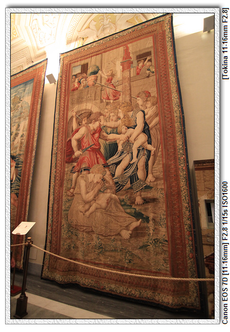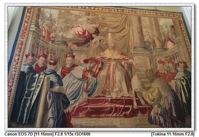 進入掛毯陳列室,裡面一共有19幅巨大掛毯,掛毯裡的都是耶穌生平的事蹟。在早期沒有縫紉機器的時代,這些巨幅都是用人工一針一線編製出來的。在掛毯陳列室,除了顯著的掛毯之外,這裡的天花板也是一絕,都是用畫出來的立體畫。