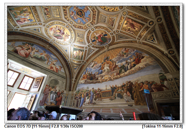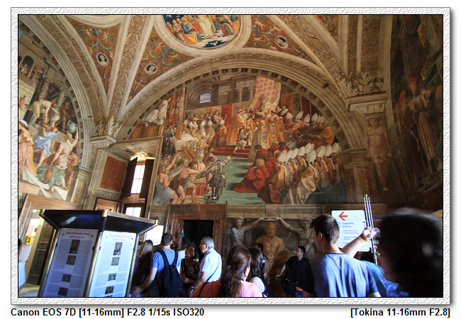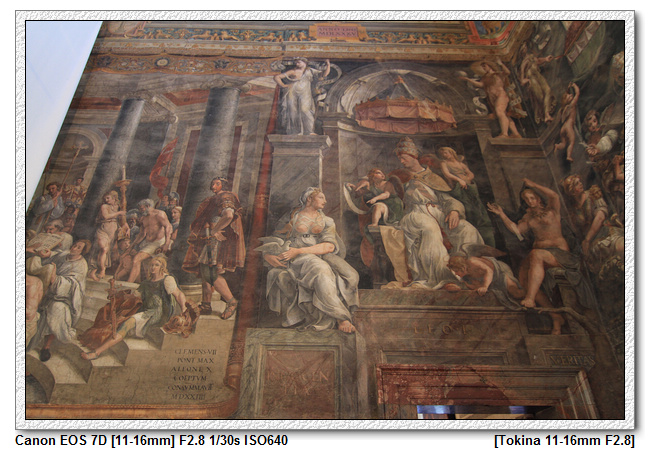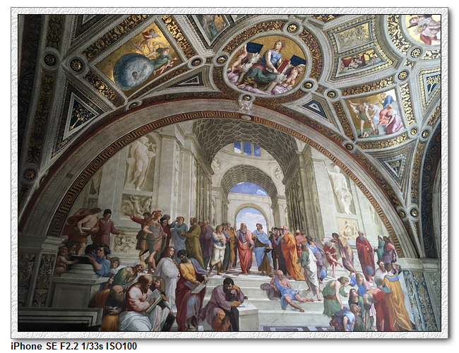 接著來到拉斐爾畫室(Stanze di Raffaello),拉斐爾畫室本來為教宗儒略二世(Giulio II)的私人住所,1508年才找拉斐爾設計四座大廳,直到拉斐爾過世,再由他的學生接手完成。拉斐爾畫風色彩鮮明,多用大量的黃色、紅色、灰白,讓畫作有種溫暖的感覺,並以透視法借助物體大小、遠近呈現立體空間感。 拉斐爾畫室一共有四廳,分別是君士坦丁廳、海力歐多路廳、波哥區火災廳,簽署廳,不過一進去就搞不清楚哪個廳了。