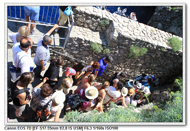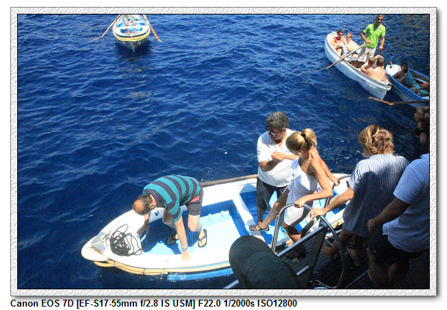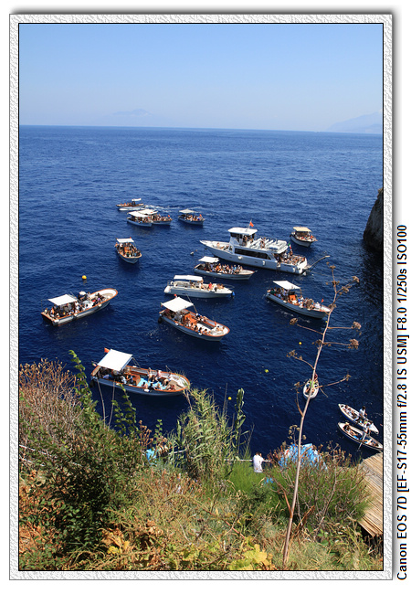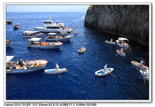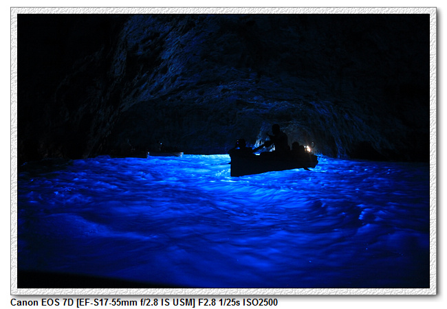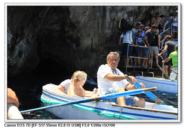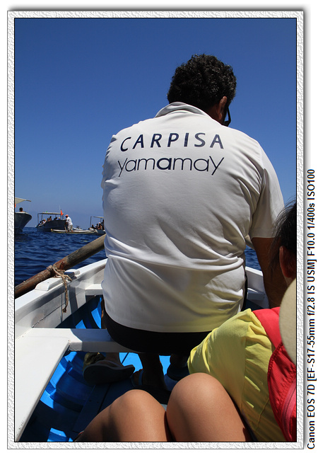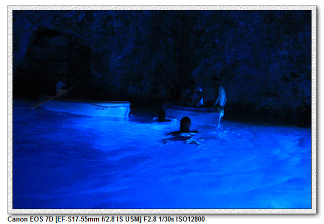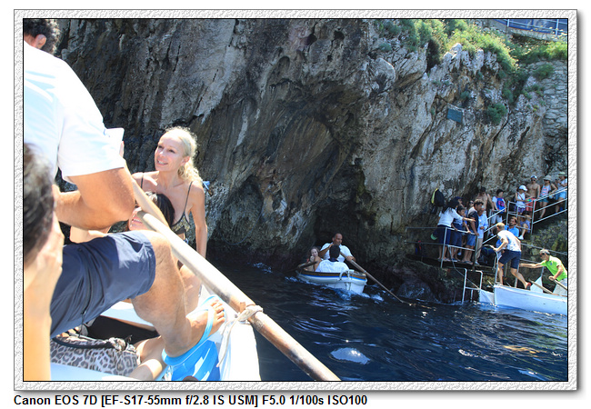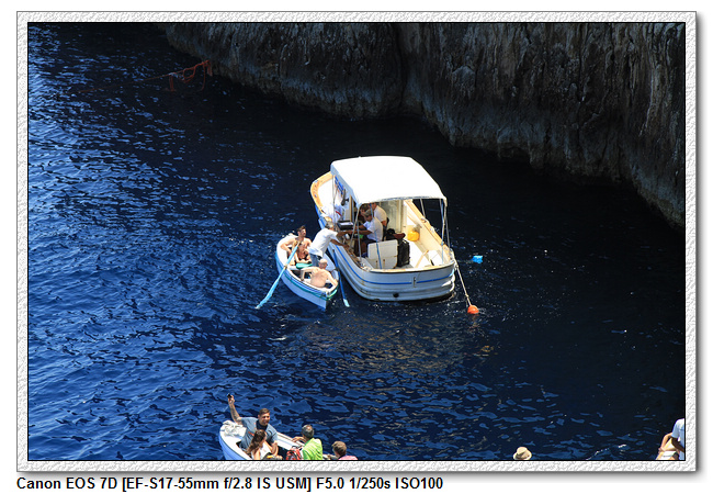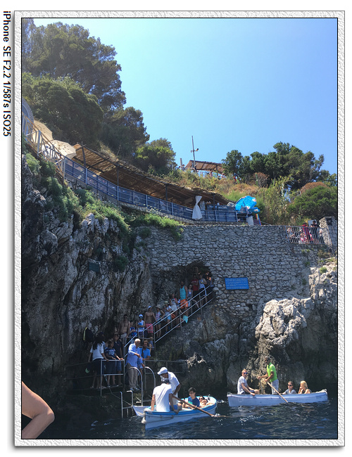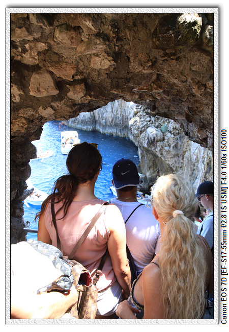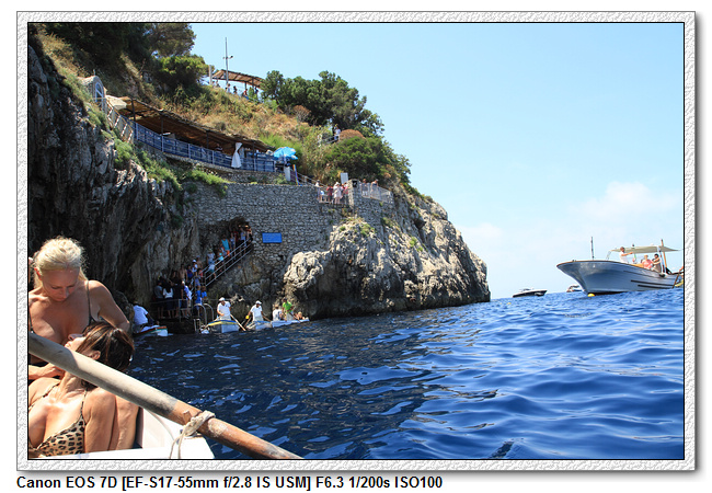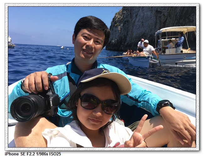 和我們一起坐小船的是兩位穿比基尼、看起來比小羽媽年紀大的開放姊姊,一上船兩個人和船夫一路上一直說話(應該是義大利人,因為說的是義大利語),船夫幾乎沒怎麼理小羽一家三口,除了一開始收費和進入洞口後稍微介紹了一下藍洞的成因,其餘時間(在洞口等待的10分鐘和在藍洞稍微停留的唱歌時間),船夫幾乎是和兩個姊姊打情罵俏了,當然是我們這些聽不懂他們說話內容的臆測。
