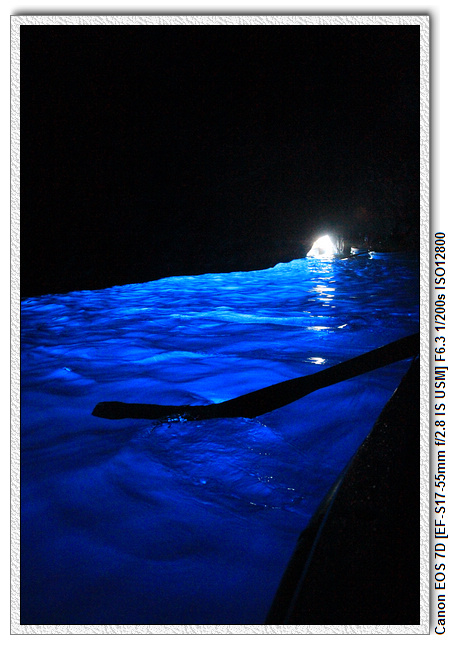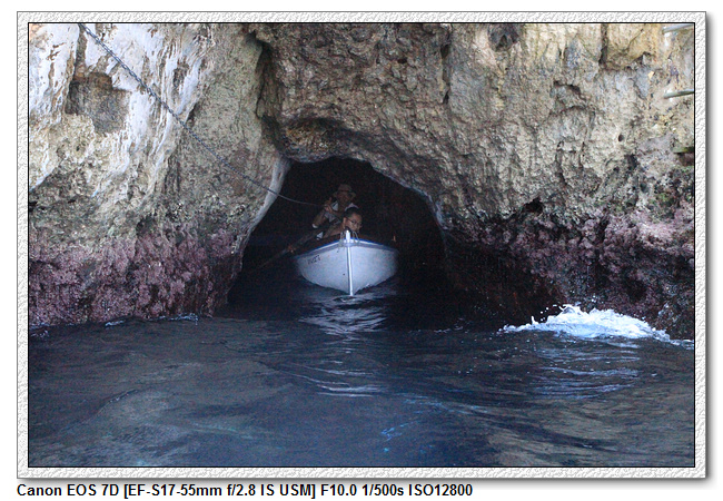 進入藍洞時,需要平躺在小船,船夫拉著岩石旁的鐵鍊進入。因為藍洞口很小,加上海水起伏,所以如果不壓低身體,進入時一定會撞到頭。好不容易,輪到我們進去,原以為整個平躺在小船上很困難,但,似乎也不用那麼平,我們都盡量壓低身子,船夫很順利的就帶我們進入藍洞中了。不得不說藍洞真的很美,但,相機實在拍不出那美麗的景色,隨著距離洞口的光線不同,藍洞的藍也不大一樣,好像從亮藍到越來越深,我們也託姊姊們福,幾乎在藍洞待了快十分鐘。小羽從一開始覺得很美,到後來明顯的感受小羽的暈船無力,整趟下來,其實坐小船的時間也才23分鐘。