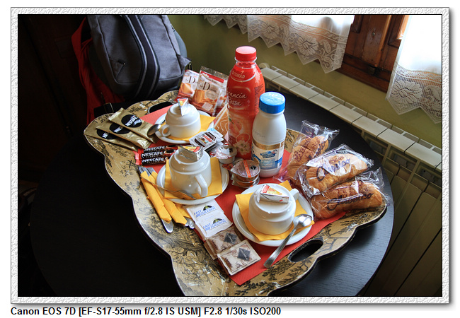 旅館接待人員相當貼心,有向我們稍微介紹了一下目前旅館所在佛羅倫斯的位置、附近景點,也提供公車資訊可以坐公車到米開朗基羅廣場。房外有個小客廳含咖啡機可以看書報、喝咖啡,房間內麻雀雖小、五臟俱全。重點是小桌子上居然擺著隔天的早餐(咖啡包、餅乾、起司、牛奶...等),豐盛是豐盛啦,問題就是佔空間,而且一點都不可口的樣子。