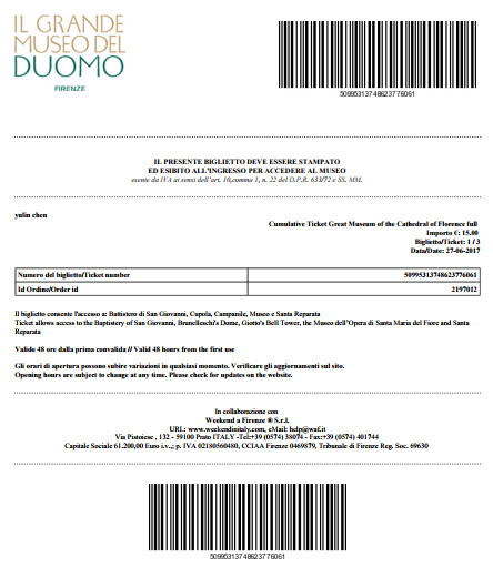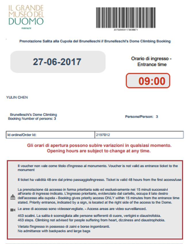 前天抵達佛羅倫斯,就已經先來百花大教堂逛逛,今天的目的是來登喬托鐘樓以及參觀大教堂內部。小羽媽早早就訂好百花大教堂的票劵,就小羽媽的說詞,票劵的mail是好幾頁,要記得印出有條碼的那頁,因為這裡所有的入場都是刷條碼。