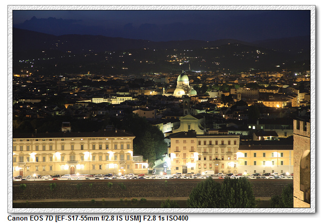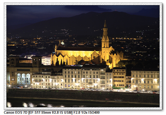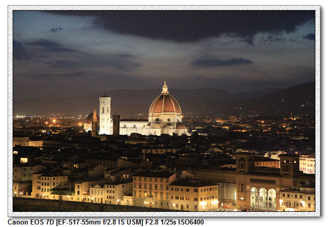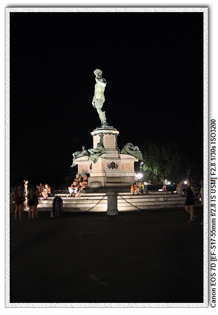 義大利這個時期,天黑時間大約都在晚上9點,因此晚餐後回到旅館休息 一下,直到9點我們才出門搭公車前往米開朗基羅廣場看夜景。因為手邊只剩下3張票,因此我們有點投機的方式,先搭公車抵達廣場之後,只待半小時,馬上再搭車回車站,這樣就完全在車票可使用範圍之內後 。加上據說夜晚的義大利不是很安全,大部分的網站都不建議太晚出門,但我們幾乎都在坐車,應該不會有太大的問題。