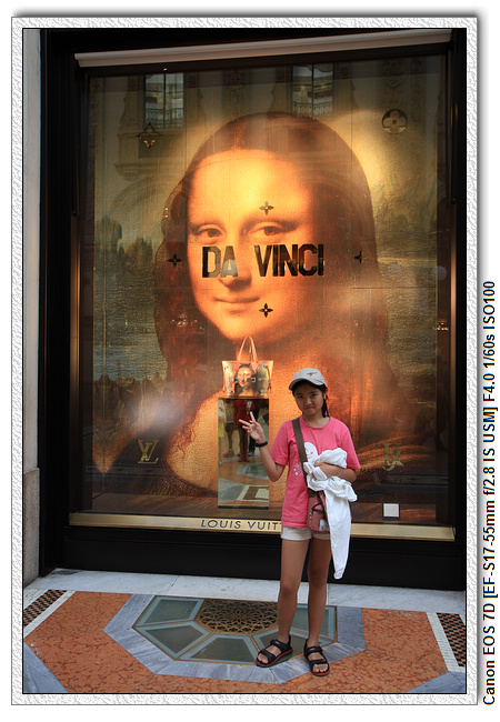 離開博物館後,沿著艾曼紐二世拱廊走到史卡拉劇院門口。艾曼紐二世拱廊基本上就是一個精品百貨商圈,對於不愛買精品的一家人,幾乎就是直接穿過拱廊直達史卡拉劇院門口的史卡拉廣場,坐著休息一下,再回中央車站前,讓小羽去用腳根踩住拱廊地板上金牛的一個洞拍照。