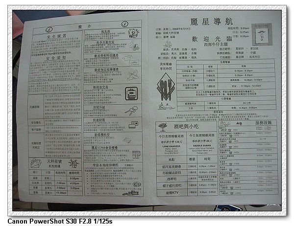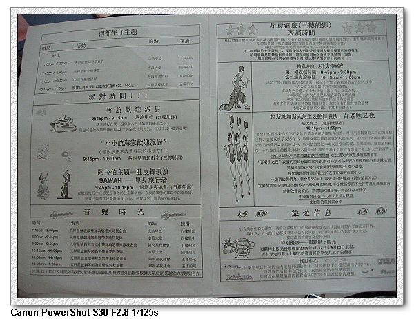 船上有很多活動,而每天都會有人放節目表在門口,記得每天要看一下門口,不然可就會錯過許多節目。