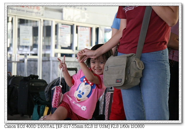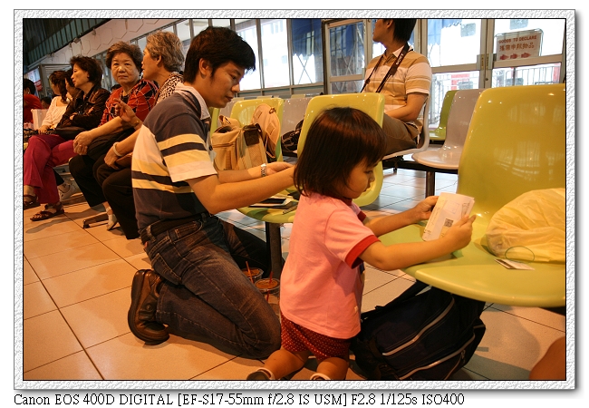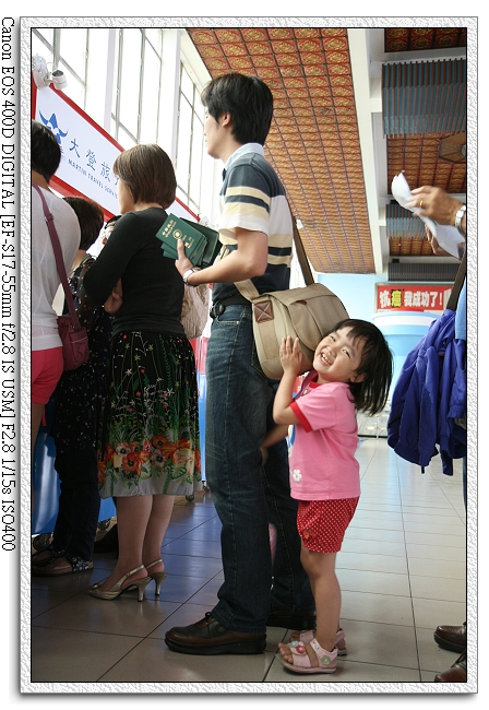一進基隆港口大廳,直上二樓,想不到還有人比我們還早到。我們大概是第六位到的。小羽可high的很,應該是有冷氣可吹(一直喊"流汗了~流汗了~"),外面天氣還不錯,有別於前幾天的颱風天氣(差點出不了船),原本五點才開始報到,不過工作人員四點半就開始作業,因此提早領取船卡以及其他文件。