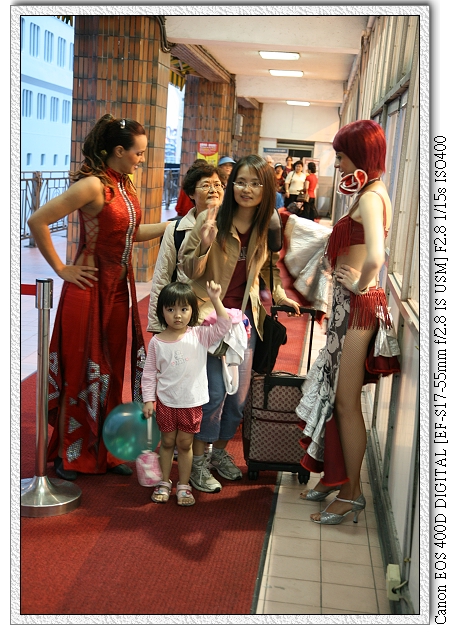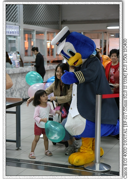 等到六點,開始登船前的入關程序。大家依序入關看證件,就像搭飛機時要檢查護照一樣。入關後,有隻大鴨子(還是企鵝?)等著跟大家拍照留念(相片是要買的!)。小羽抱著剛拿到的汽球有點害羞的一直看那隻大鴨子。登船前還有兩位俄羅斯美女。(小羽 爸側拍時,還被旁邊工作人員制止。(又沒說不能拍~)