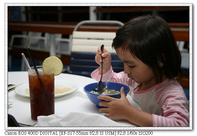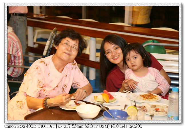 一登船,找到自己的房間後,馬上到九樓甲板吃BBQ烤肉(小羽爸還點了一杯"長島冰茶")。其實整個餐點真的還不錯 ,所以就沒有再去吃所謂的晚餐。吃過晚餐,回到房間,小羽媽才發現錯過隔天的船長晚宴(因為那是要在晚上七點到八點間事先定位的)。雖然網路上都說沒什麼 ,可是小羽媽還是有點小哀怨。