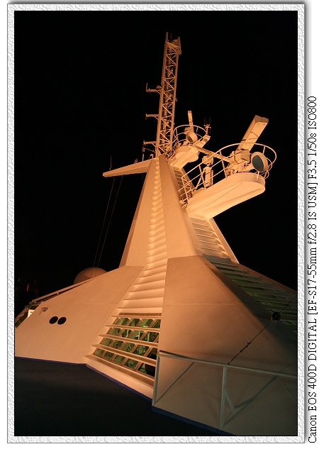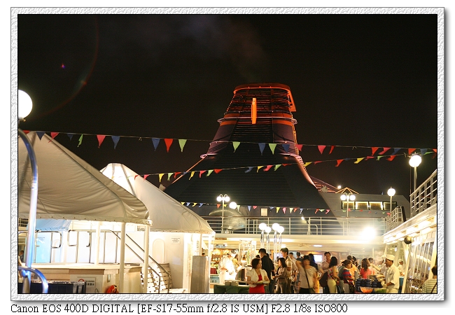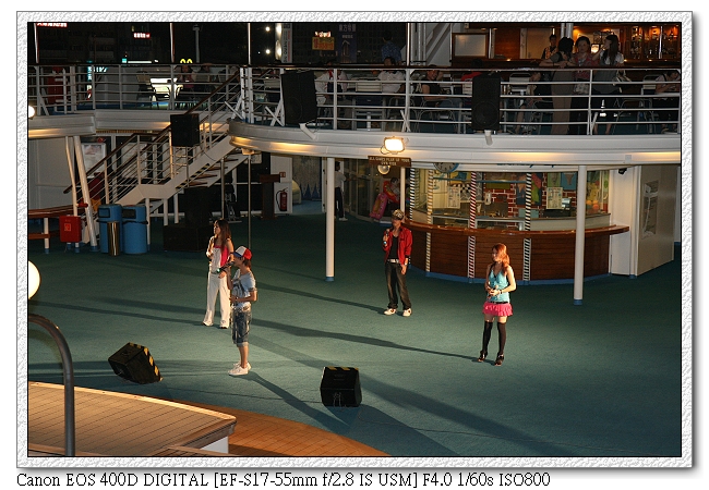 七點時...泳池甲板有天秤號表演樂隊的演唱,由四位主持人(應該是來自新加坡吧?)唱歌帶動氣氛。(還可以點歌喔,雖然有很多點的歌都不會唱。但也不能怪他們,誰教聽眾都點台語歌~)