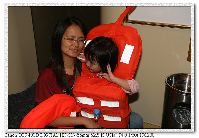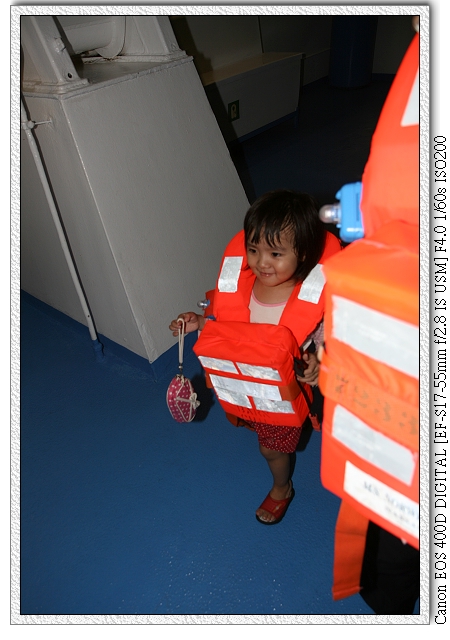 8:15,天秤星號進行一次安全演習,規定每個人都要參加。還要從自己的房間拿救生衣到指定地點集合(船卡上有標示集合地點)。我們是在C4,也就是六樓船尾。小羽很愛穿救生衣,原本穿大人的,後來工作人員拿了一個小孩size給小羽穿。