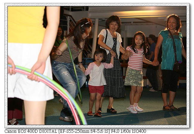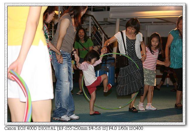 快九點,小羽和小羽爸、媽到泳池甲板參加啟航歡迎派對。所謂啟航派對,當然就是啟航時的派對(九點才開船~未免有點久吧~)。甲板上有人隨著主持人一起唱YMCA、跳舞。小羽媽也拉著小羽一起去玩(小羽媽真是積極參與活動)。之後還有玩一群人圍成圈,呼拉圈一個人一個人通過的遊戲。小羽也很開心的跟著不認識的阿姨一起牽手(小羽媽代替小羽被淘汰),會和大家一樣讓呼拉圈通過身體。很厲害喔~~~