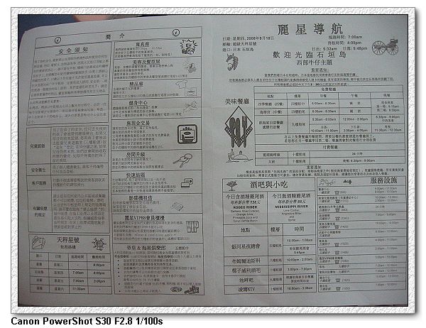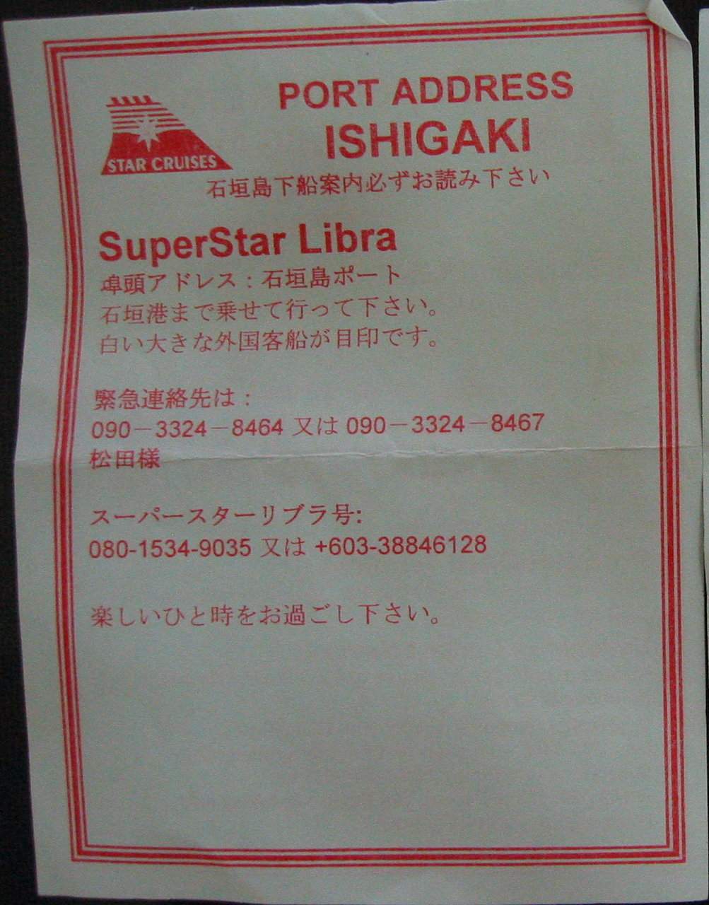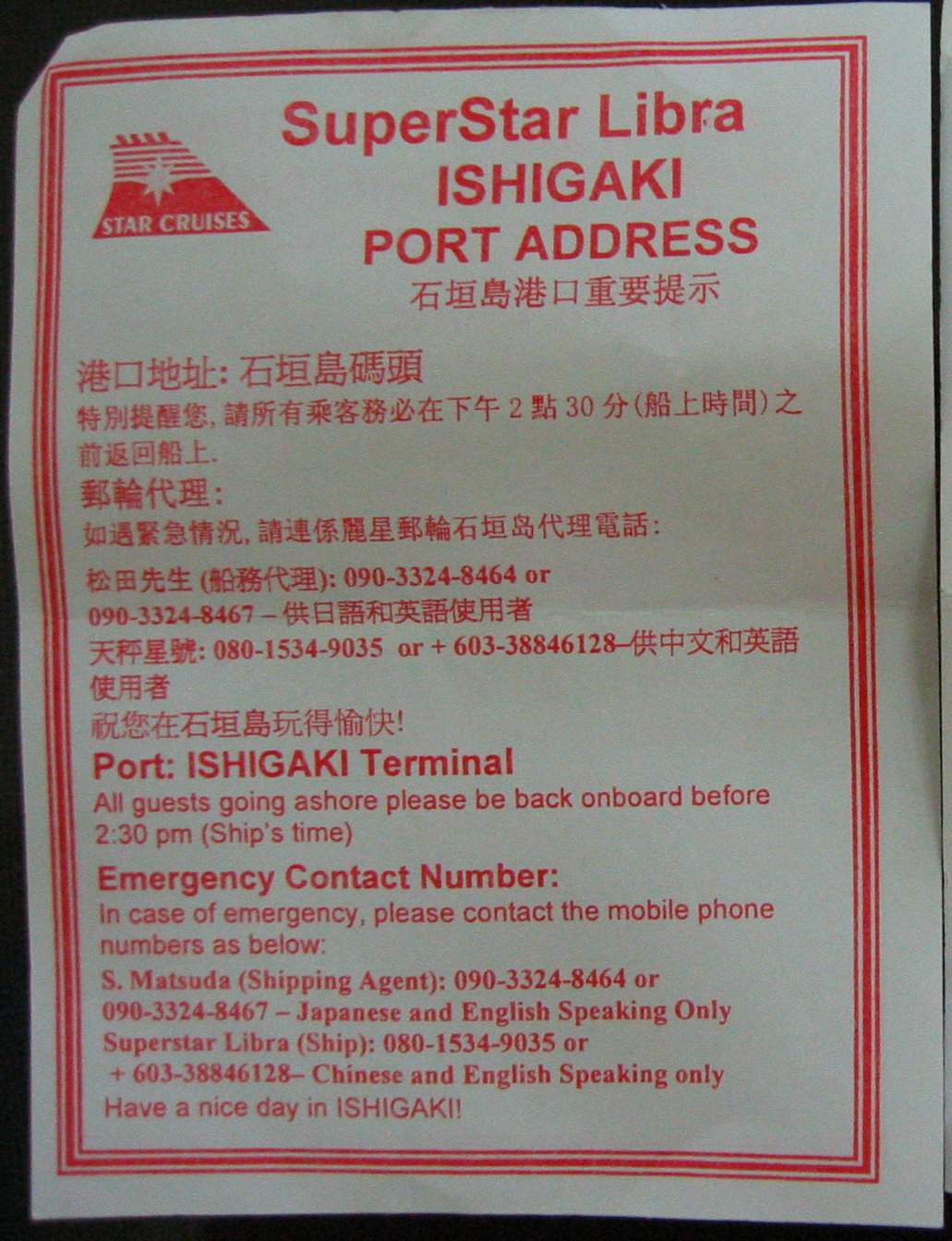 下船時,每個人皆會拿到一張簡單的"紙",上頭有寫船目前停靠的位置(一面是中文,另一面是日文)。讓你迷路時可拿紙問人找回家的路。