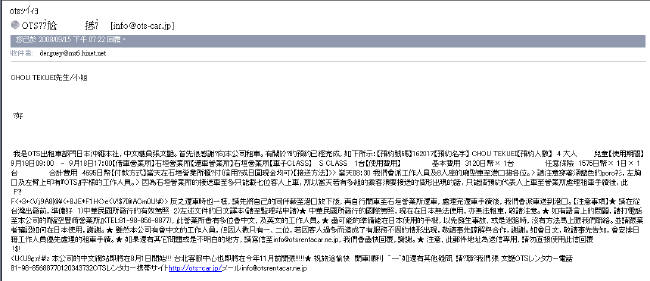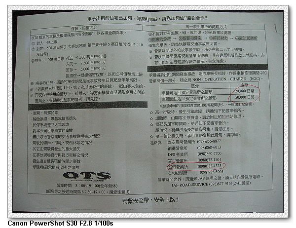 本以為就這樣,結果沒想到出發前2天又收到一封來自OTS的E-mail,很訝異的是,竟是用中文,沒想到來有這種貼心。信中提及租車的時間及費用,還有要準備的文件等等。信緯也有提及11月將在台北成立客服中心,到時租車就更方便了。