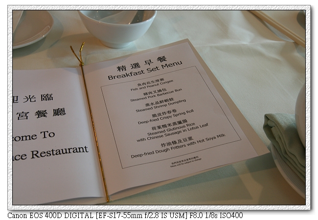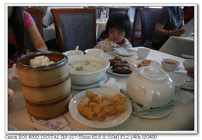 早餐是在中餐廳(海華宮)。小羽一早被挖起床,心情不是很好,吃早餐時"劫面槍",沒什麼吃。今天的早餐是(粥、豆漿、油條、水晶餃、叉燒包、糯米飯)。還不錯吃,不夠可以加點喔!
