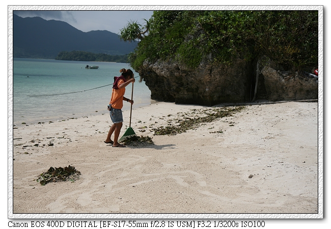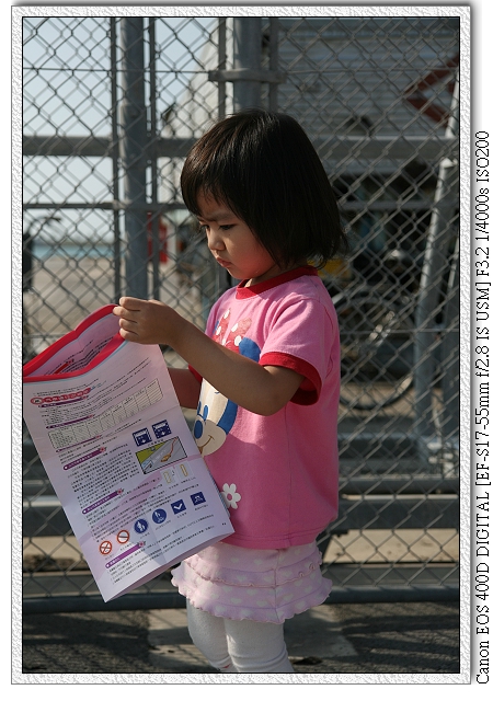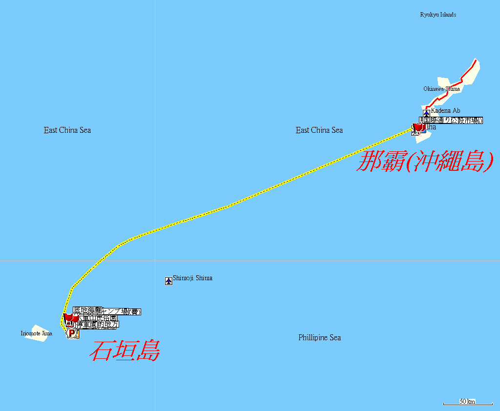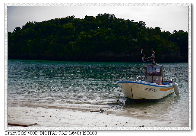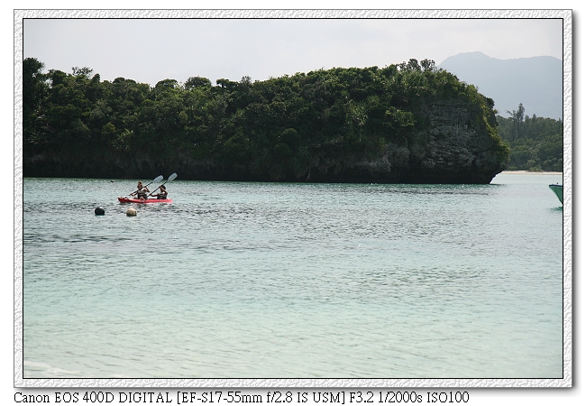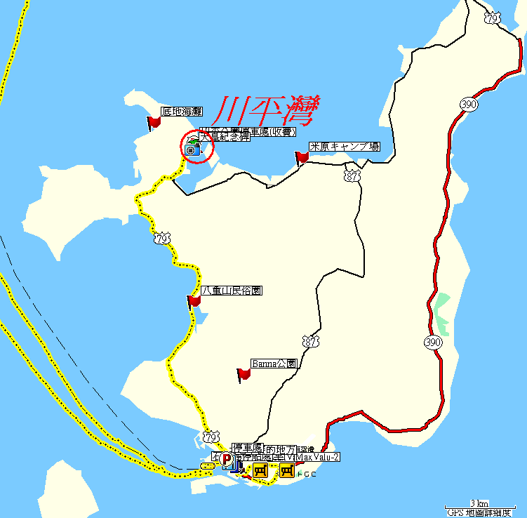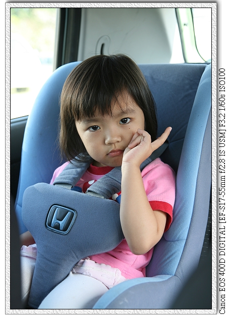 拿著收具領車,領車人員就跟台灣一樣,會帶領檢查車子,並標上有問題的地方。領完車並逐漸適應日本的右邊駕駛(每次打方向燈都按到雨刷~),開始前往川平灣。我們租的雖然是1300CC的小車(想說石垣島又不大,租小車就可以了~),但車上仍配有GPS,不過為了使用上的方便,自己也帶了Colorado 400t。一路上車流量不多,車速限速40公里。不過當地人大多超過這個速限。身為一個守法外國人,當然要遵守當地法規,所以一路上都車速只開40公里(其實是不熟路況啦~)。日本規定小孩需做安全座椅(忘了是幾歲以下~不過小羽是坐定了),小羽只好當個守法外國人,乖乖被綁在安全座椅上(小羽已經很久沒坐安全座椅了)。