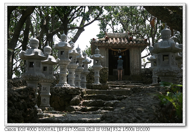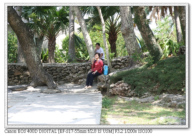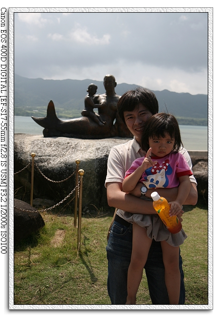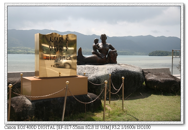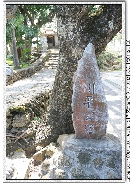 整個川平公園不大,走到盡頭,有個"日本天皇到此一遊"的紀念碑。旁邊是個賣珍珠的店。因川平灣是石垣島產珍珠的地方。小羽又熱到不行"劫面槍"了。