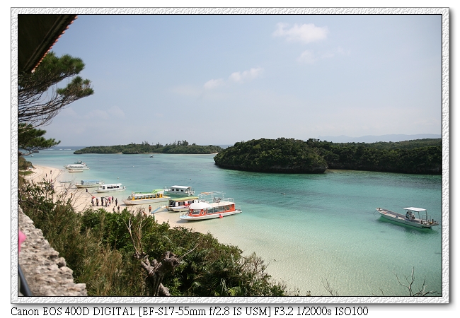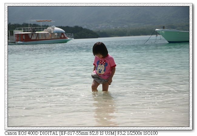 川平灣,是典型白白的沙灣。川平公園旁有"無料"停車場,不過我們晚到,都被計程車佔走了,只好停"有料"停車場(花了300日幣)。一到川平灣,小羽媽當然就帶著小羽在沙灣上踩水。水是乾淨到不行,只不過太陽實在太大,玩不到半個鐘頭,小羽媽就催促小羽離開。平常非常怕熱的小羽,因為超愛玩水,還是拖了一陣子。