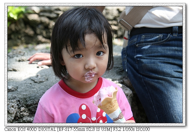 走回川平公園時,遠遠的就發現台北阿媽已經坐著吃冰淇淋(台北阿媽想去旁邊商家血拼,所以就沒有跟著走)。肚子餓的小羽當然也先吃了一個冰淇淋解餓,小羽這次居然選了平常不會選的草莓冰淇淋,而且還不吃餅乾的部分(真挑~誰家的小孩啊?)。